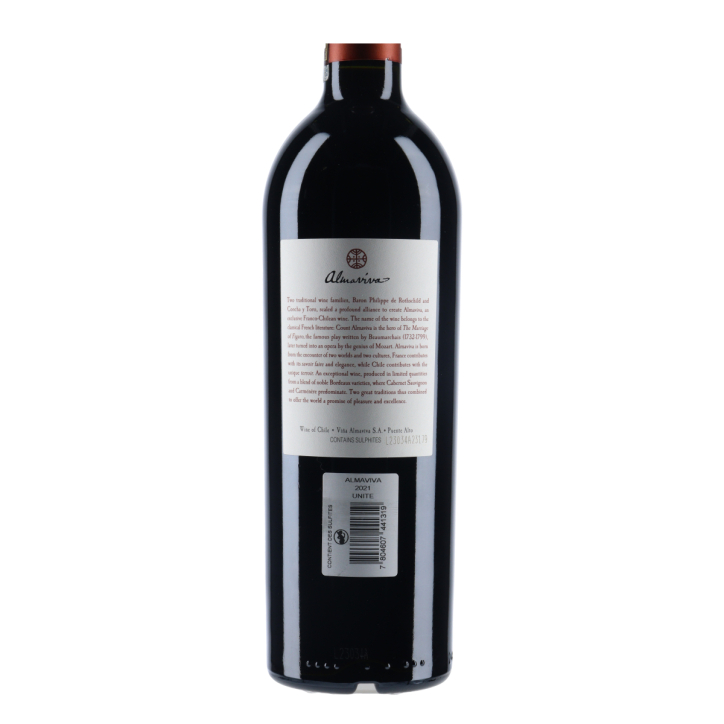 Inaugurée en 1997, Viña Almaviva représente la fusion des savoir-faire viticole et vinicole français et chilien. Le domaine est un modèle de technologie et de respect de l'environnement, s'engageant dans une production durable et de haute qualité. Chaque millésime d'Almaviva est l'expression d'une quête incessante d'excellence, reflétant la richesse et la diversité de son terroir chilien, avec un engagement profond envers l'élégance, la complexité et la finesse. Situé dans la vallée du Maipo et réputée pour la production de Cabernet Sauvignon de haute qualité, Almaviva bénéficie d'un terroir exceptionnel, où le climat méditerranéen et les sols variés offrent des conditions idéales pour la culture de cépages bordelais.