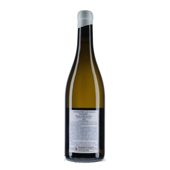 Le Bourgogne Hautes Côtes de Nuits Blanc 2022 du Domaine A.F. Gros se distingue par sa robe brillante aux reflets dorés. Son nez séduit avec des arômes délicats de fleurs blanches, de poire et de pêche, accompagnés de subtiles touches minérales. En bouche, ce vin offre une belle fraîcheur, équilibrée par des notes d'agrumes et une légère minéralité, qui se prolongent dans une finale élégante et persistante.