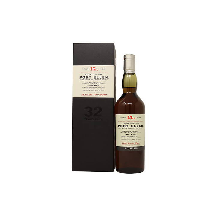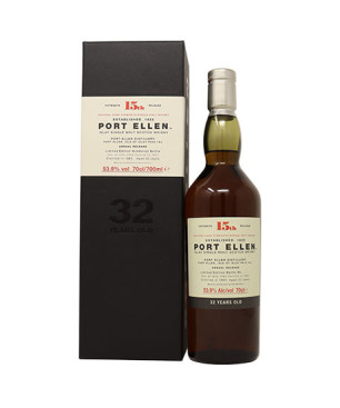 Fondée en 1824 au sud de l'île d'Islay, Port Ellen fut la tête de proue de l'industrie du whisky au 20ème siècle. Les expérimentations techniques menées à la distillerie revolutionnèrent les processus de production de toutes les autres distilleries. Fermée en 1983, Port Ellen a perdu sa licence depuis 1992. Les quelques bâtiments restants furent abattus au début des années 2000... Depuis 2005, ce single malt fumé et très iodé, très recherché des amateurs se fait de plus en plus rare. Seulement 2 964 bouteilles numérotées sont disponibles dans le monde.