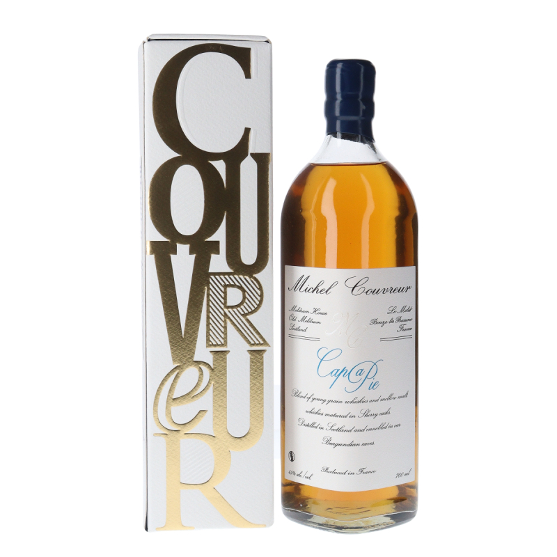 Ce blended whisky "Cap a Pie" de Michel Couvreur est issu d'un assemblage de whiskies de grain et de malt. Ce whisky a été élevé en fûts imprégnés en whisky pour les grain et en PX et Olorso pour les Malts. Ce blended whisky est sorti en 2018 et Michel Couvreur espérait le devenir un whisky iconique de sa gamme de whisky bourguignon. La recette de ce whisky est similaire à "The Unique", avec une plus forte proportion de whiskies de malt qui le rend plus complexe tout en conservant sa fraîcheur. On retrouve un parfum iodé avec un soupçon d'avance, de douceur vanillée, une touche floral et quelques notes de fruits blancs. En bouche, ce whisky est nerveux mais très rond avec une pointe de Xeres. Il est gourmand, gouleyant. La proportion de whiskies de malt importante offre une persistance plus complexe.