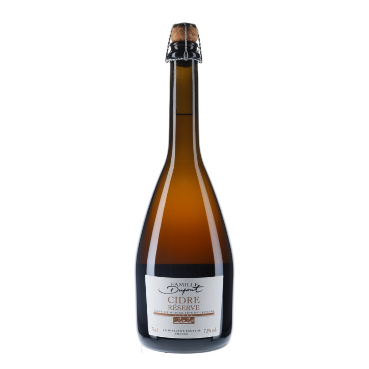 La Cuvée Réserve de la famille Dupont passe six mois en fûts de chêne ayant contenu du calvados. Cet élevage lui apporte de la finesse et une belle complexité. Un cidre de gastronomie qui est élaboré avec une fermentation contrôlée en cuves en inox avec des levures indigènes Le contrôle de la fermentation est fait par soutirages successifs. Le cidre est ensuite transféré dans des barriques de 400 litres ayant contenu du Calvados, où il va lentement s'affiner pendant six mois. Ce Cidre est non pasteurisé, étant sur lies, il s'affinera et deviendra plus complexe avec le temps. Un grand cidre gastronomique.