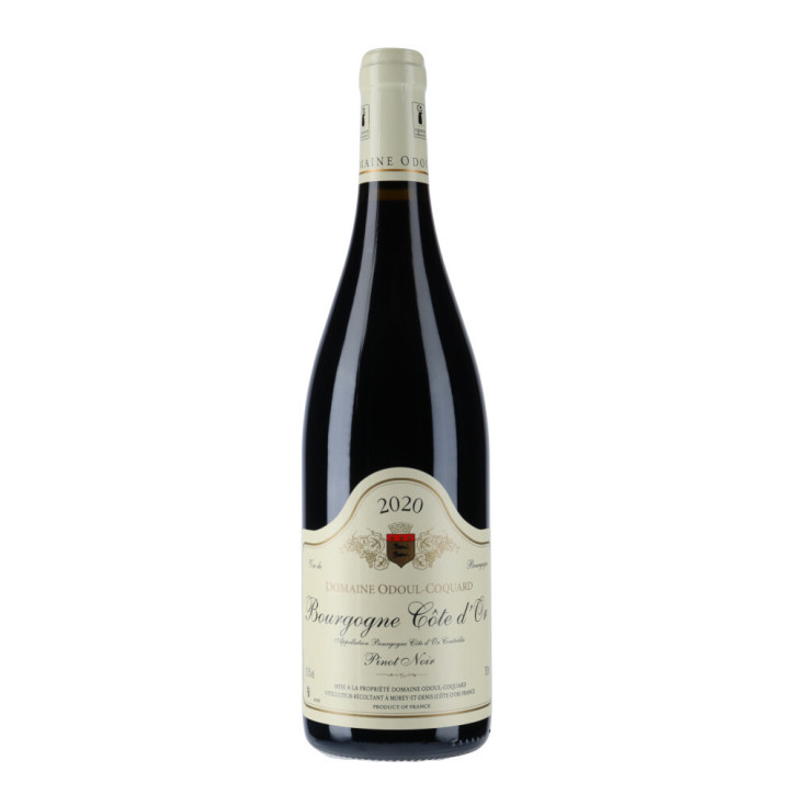Ce Bourgogne Côte d'Or Pinot Noir 2020 du Domaine Odoul Coquard est un vin rouge de Bourgogne intense et fruité. Ce 100% pinot noir est issu de vieilles vignes proches de Chambolle-Musigny et Gevrey-Chambertin. Les raisins sont vendangés à la main puis sont égrappés et triés. Elevage en futs. Un vin rouge expressif avec une belle minéralité.