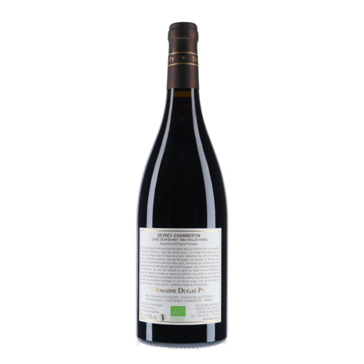 Le Domaine Dugat Py est une référence incontournable en Bourgogne, reconnu pour son savoir-faire traditionnel et son respect du terroir. Situé au cœur de Gevrey-Chambertin, le domaine est dirigé par la famille Dugat depuis plusieurs générations. Leur approche méticuleuse de la viticulture et de la vinification se traduit par des vins d'une grande finesse et d'une authenticité remarquable. Le Coeur De Roy est l'une de leurs cuvées emblématiques, témoignant de l'excellence et de la passion qui animent ce domaine d'exception.