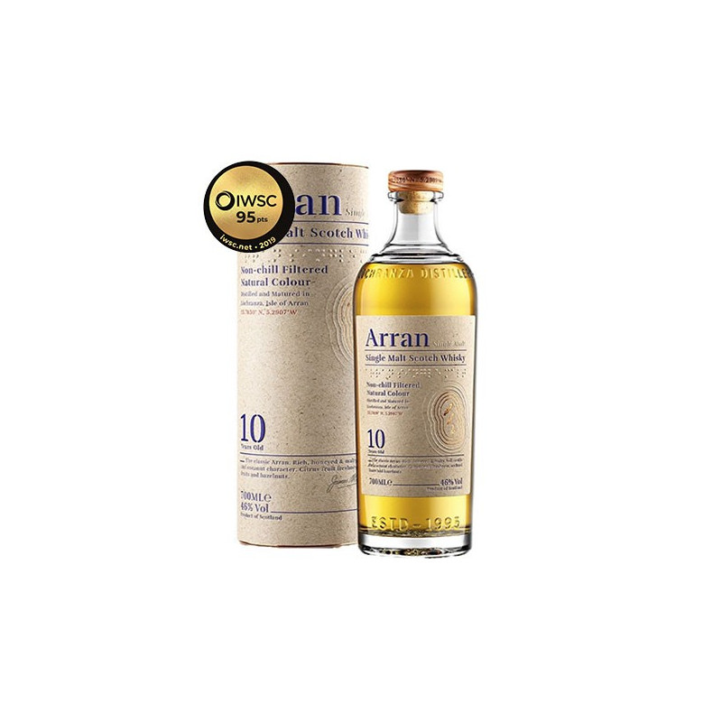 À la dégustation, l'Arran 10 ans dévoile des arômes intenses de pomme, de vanille, et de caramel, équilibrés par des touches d'agrumes et de miel. La bouche, ronde et crémeuse, évolue sur des saveurs de noisette, de chocolat noir et de poire, caractéristiques des whiskies single malts d'exception. La finale longue, marquée par des notes boisées et épicées, rappelle le caractère pur et naturel de ce whisky écossais.