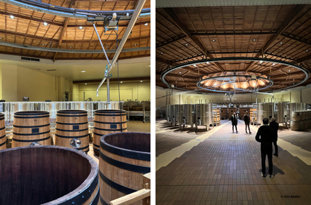 Nous avons ensuite visité la cuverie des vins rouges, conçue en forme arrondie créée en 1997. Ultra-fonctionnelle, elle permet de vinifier les raisins selon un procédé respectueux, où ces derniers, après tri, sont acheminés par gravité dans les cuves. Ce détail témoigne de l’importance accordée à la précision et à la finesse dans l’élaboration des vins de la Maison.