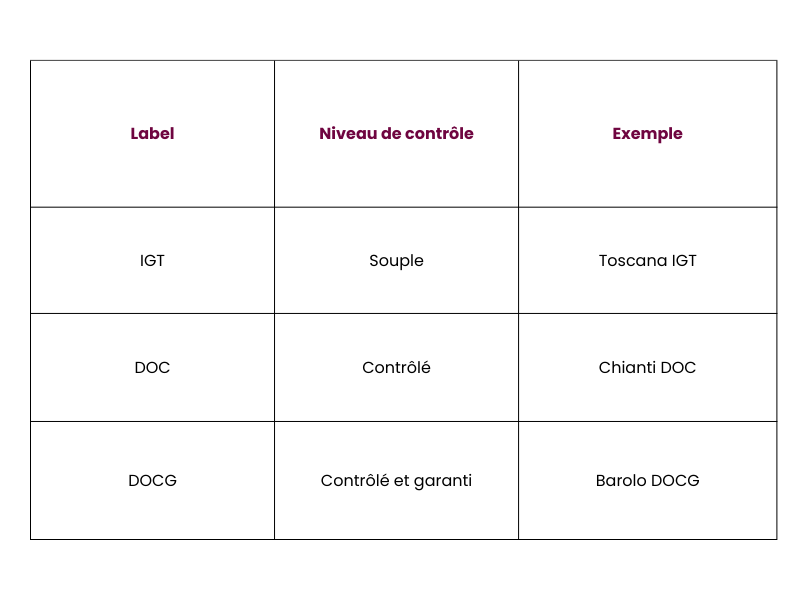 Contrairement à la classification française (AOC), le système italien distingue trois niveaux principaux : IGT, DOC et DOCG.