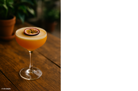 Shakez tous les ingrédients et versez dans un verre à cocktail. Ajoutez une demi-passion pour la touche finale. Gourmand et vibrant.