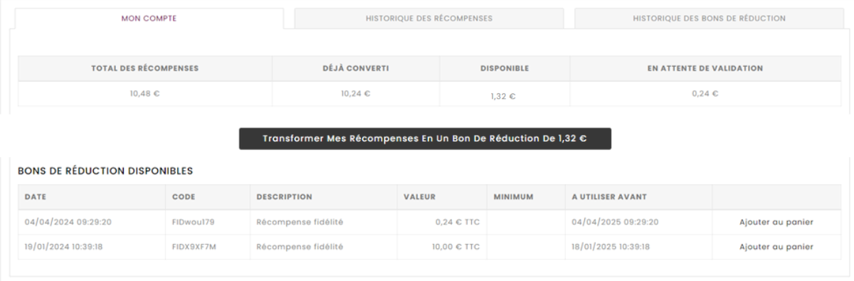 Vous pouvez transformer vos récompenses disponibles en cliquant sur le bouton « transformer mes récompenses en un bon de réduction de xx, xx € »